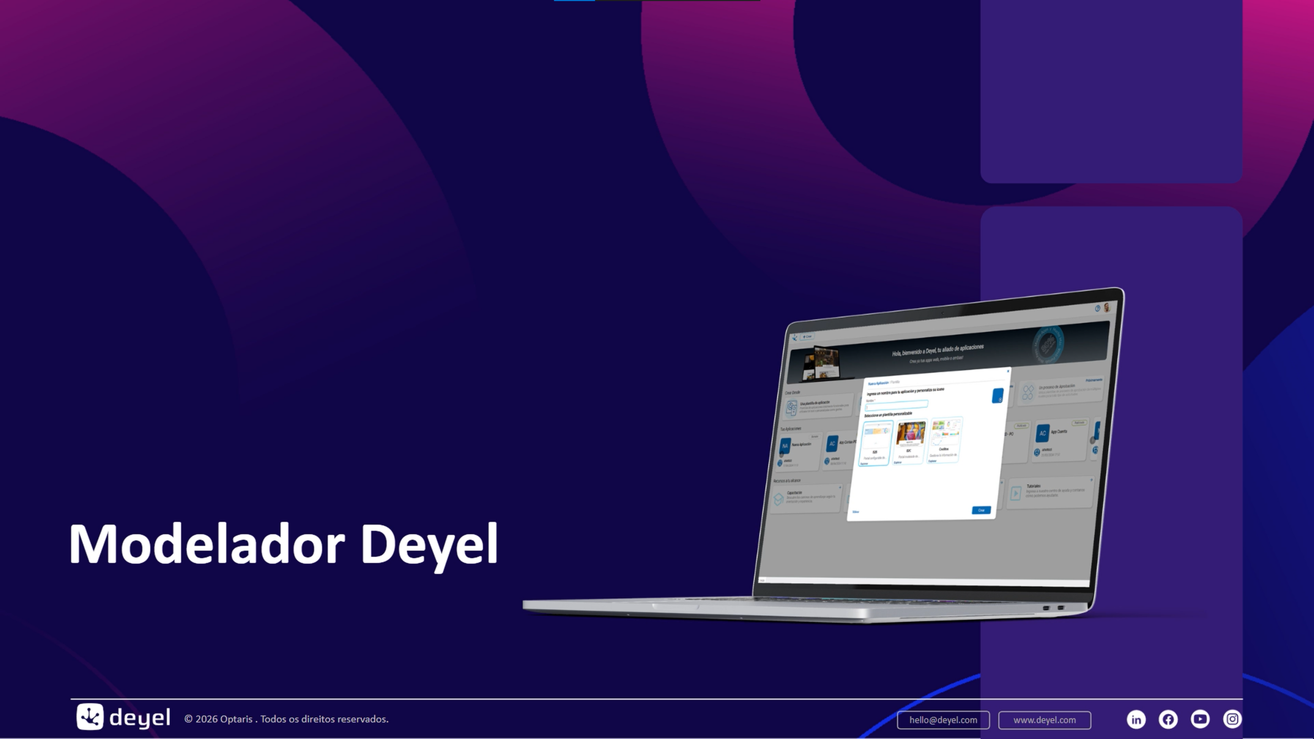 São introduzidos os conceitos fundamentais da modelagem de aplicativos, bem como a incorporação da Diana, a assistente de inteligência artificial da Deyel, que acompanha o usuário diretamente no modelador, ajudando a compreender a plataforma, orientando o processo de modelagem e facilitando a tomada de decisões.